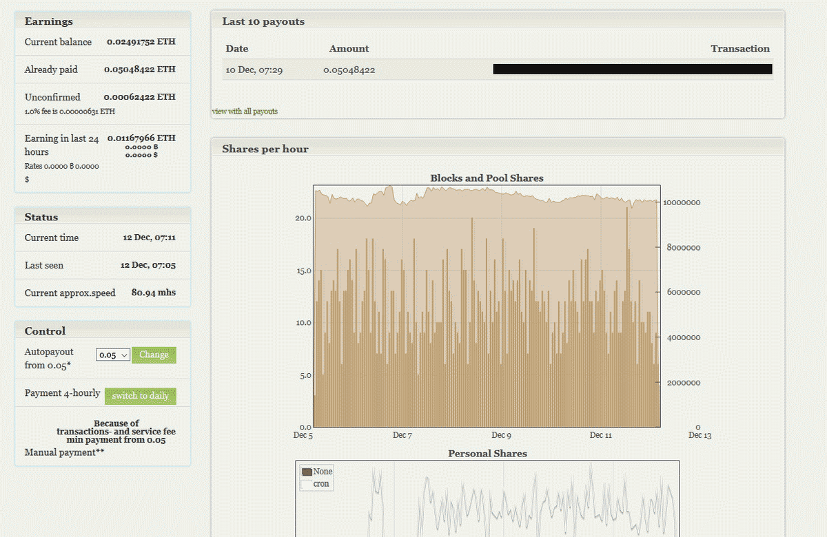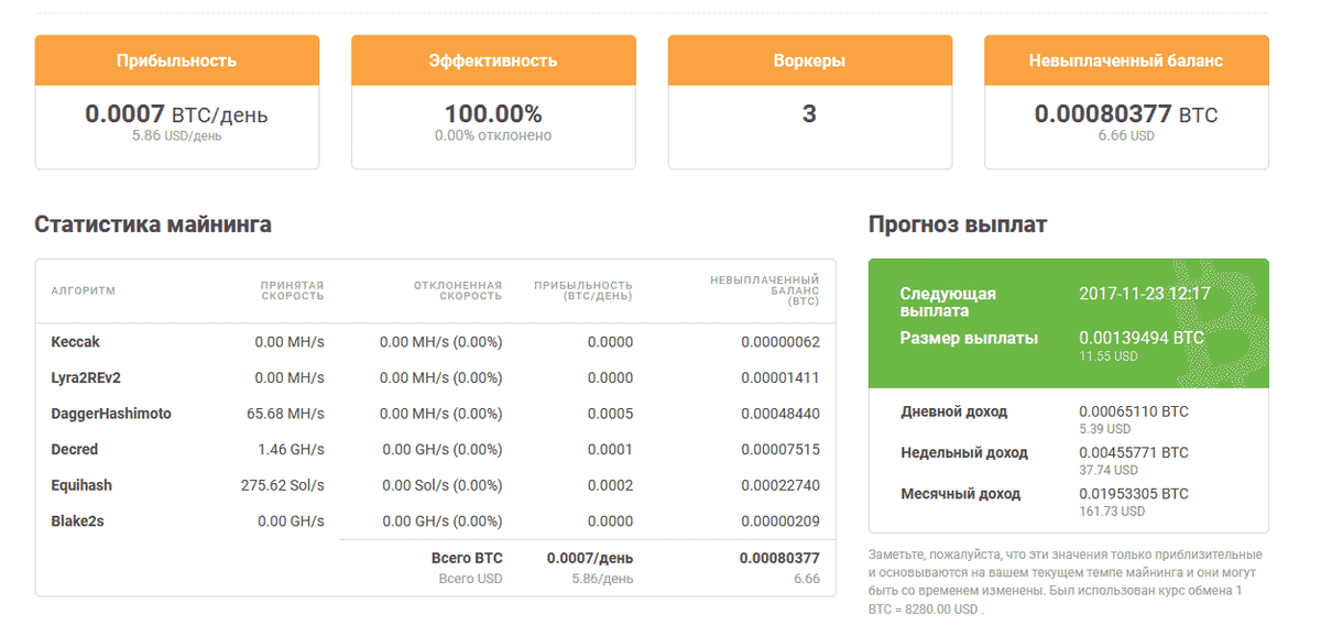 Вот так выглядела статистика майнинга в нашем аккаунте на «Найсхеше» 23 ноября 2017 года