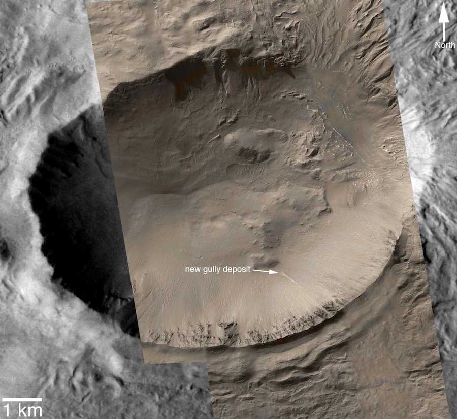 Фотография возможного водостока в одном из кратеров Марса, сделанная во время миссии Mars Global Surveyor, 2005 год