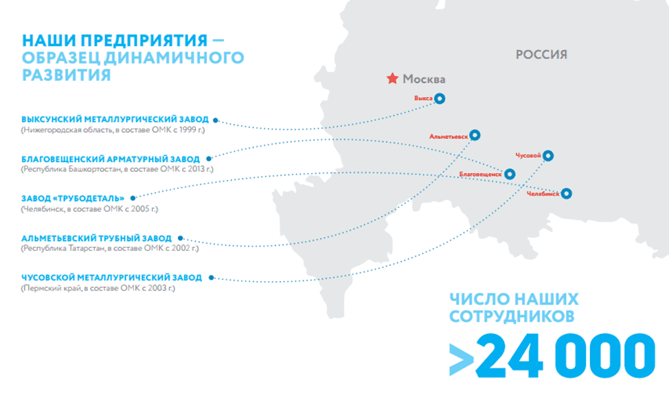 Продукция ОМК поставляется более чем в 30 стран мира. На предприятиях компании работает порядка 30 тысяч человек.
