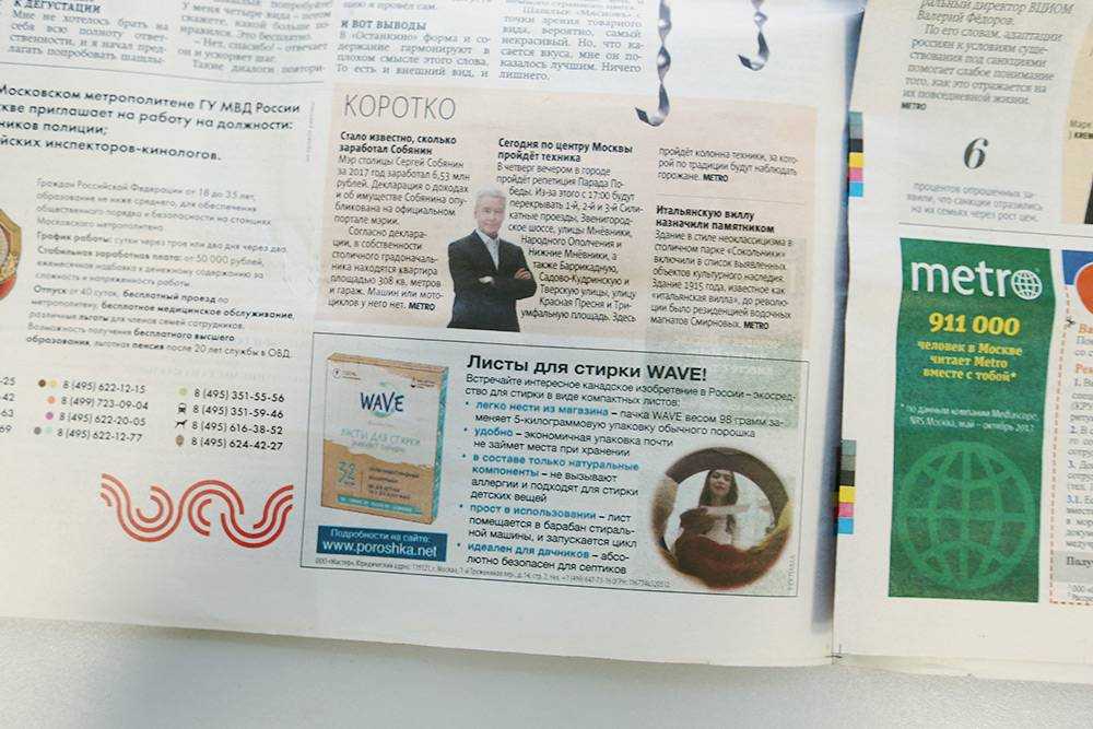 Реклама в прессе. Для рекламы в СМИ выбрали газету «Метро». Серия публикаций обошлась нам в 50 тысяч рублей. Охват аудитории — 1,25 миллиона человек.