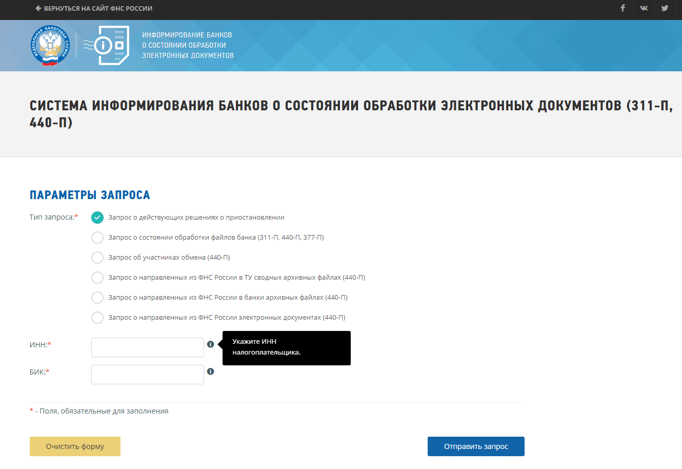 Наличие или отсутствие блокировок по счету можно проверить на сайте ФНС России по данной ссылке. Для проверки надо выбрать из представленного списка тип «Запрос о действующих решениях о приостановлении», указать ИНН юридического лица и БИК банка (любого, в котором открыт счет фирмы). Форма выглядит так: